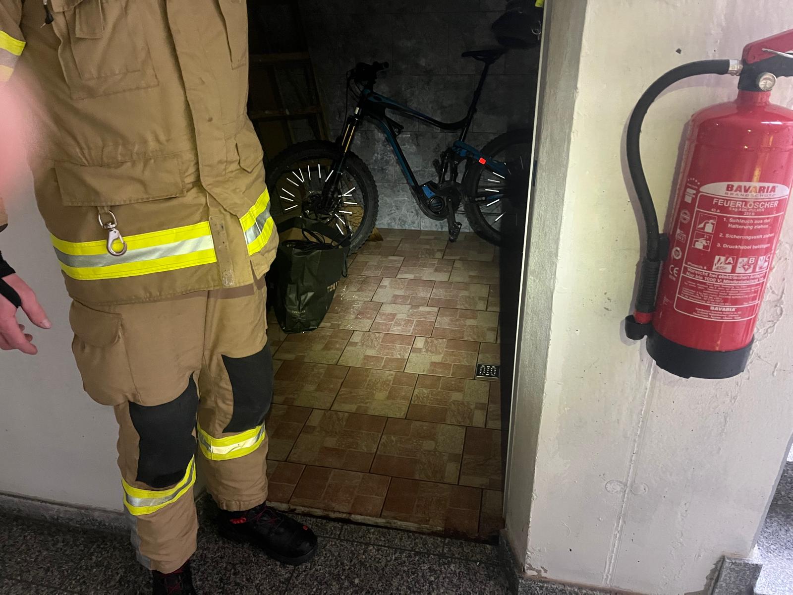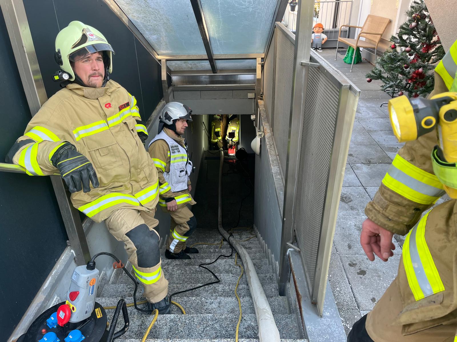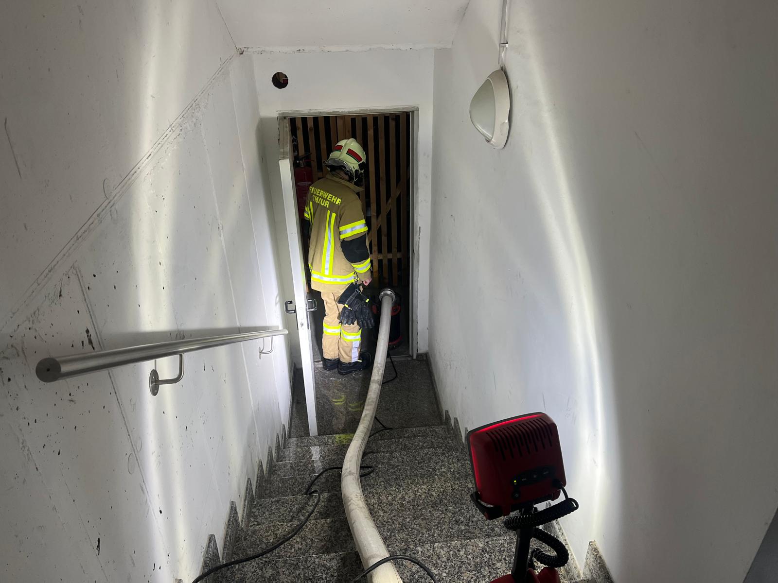 Mithilfe einer Tauchpumpe und eines Nasssaugers pumpte die Feuerwehr das Wasser ab, welches sich in einem Vorraum und bereits in diversen Kellerabteilen ausgebreitet hatte.